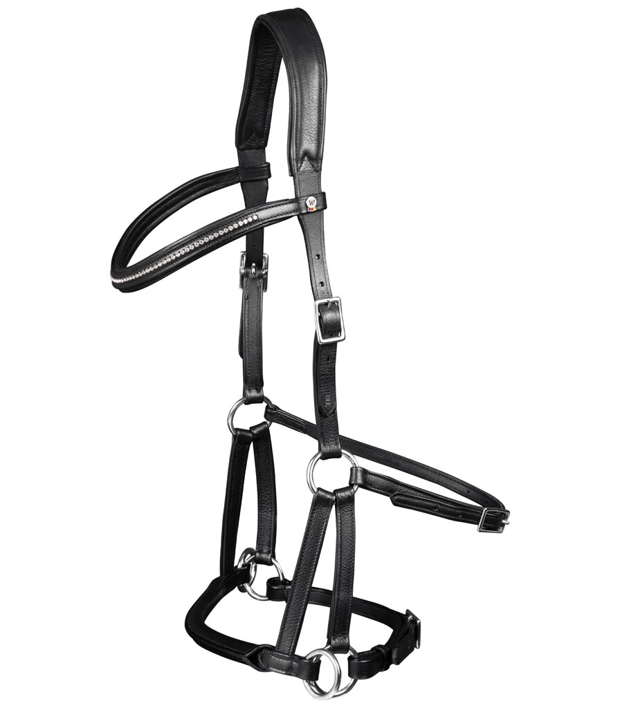 Anatomicky tvarovaná, bezudidlová uzdečka s měkce podloženým nánosníkem, nátylníkem a čelenkou. Na uzdečku byla použita ta nejkvalitnější kůže. Čelenka je zdobena kamínky, kování uzdečky je z nerezové oceli. Uzdečka se dodává včetně otěží.• anatomicky tvarovaná