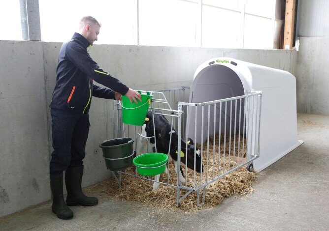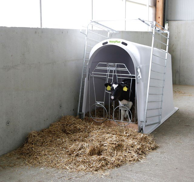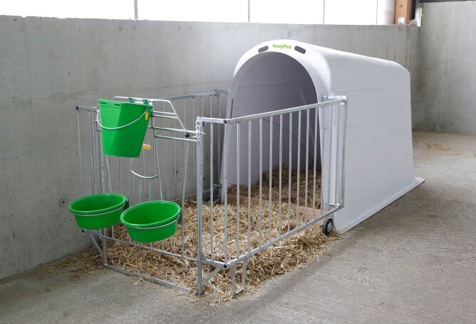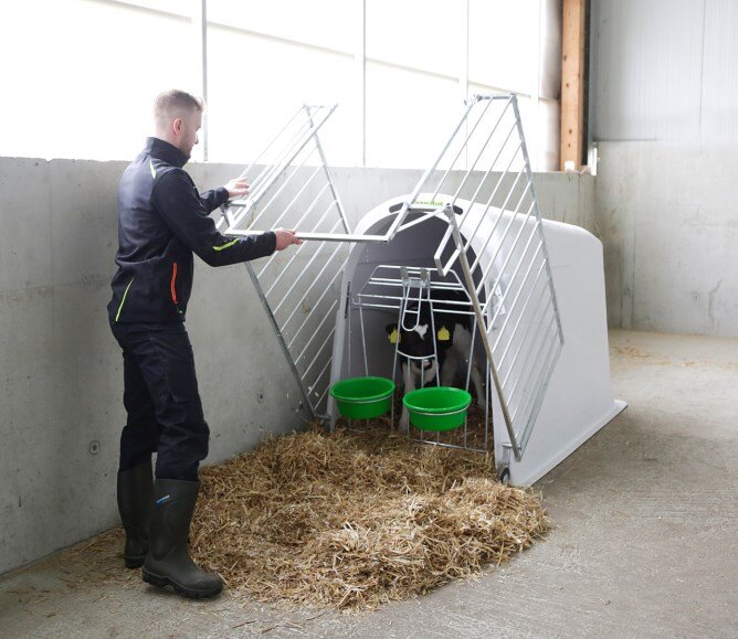 Velkorysé rozměry boudy nabízejí dostatek prostoru a ochrany proti povětrnostním vlivům pro tele a prostor pro ošetření telat pro farmáře.