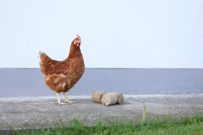 • brikety se rozpadají, když si s nimi kuřata hrají, a slouží pak také jako savé stelivo