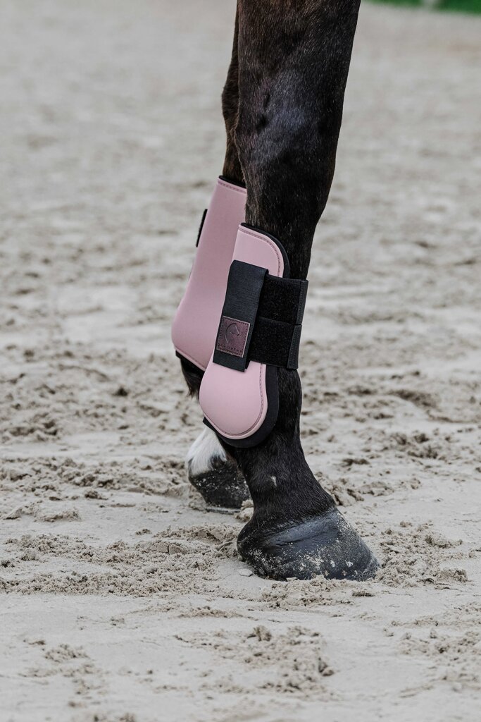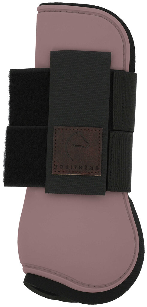 Díky praktickému zapínání na 2 elastické pásky a suchý zip se chrániče snadno nasazují, pevně drží na místě a nijak neomezují pohyb koně. Styl dotváří kožený efekt nášivky EQUITHÈME, který dodává chráničům elegantní vzhled.