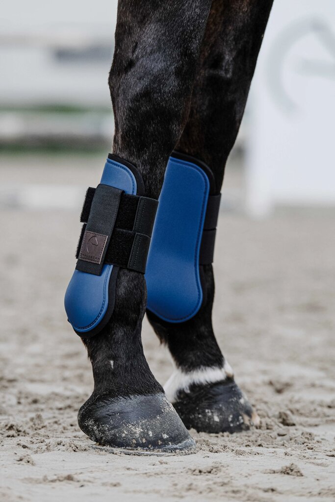 Díky praktickému zapínání na 2 elastické pásky a suchý zip se chrániče snadno nasazují, pevně drží na místě a nijak neomezují pohyb koně. Styl dotváří kožený efekt nášivky EQUITHÈME, který dodává chráničům elegantní vzhled.