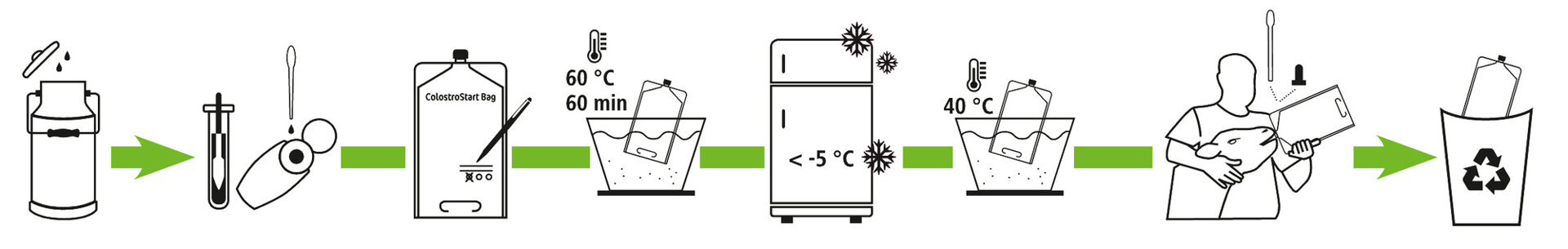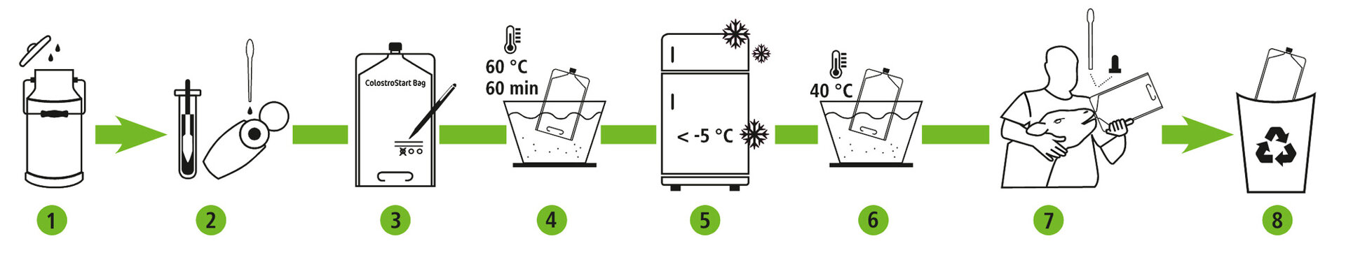 Hliníkové sáčky (4 litry) se snadno plní a lze je bez problémů pasterizovat, zmrazit a znovu ohřát.Chcete-li podat mlezivo, jednoduše našroubujte sondu na dudlík nebo drencher.