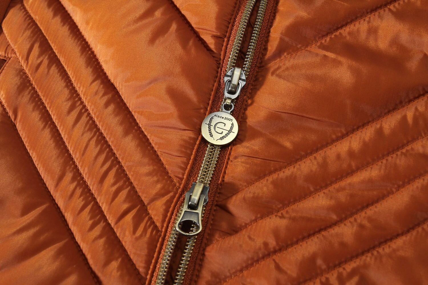 Superlehká, sportovní, dámská kombinovaná vesta z mikrovlákna a prošívaného materiálu se stojáčkovým, prošitým límcem, vypasovaným střihem, výrazným obousměrným zipem a 2 kapsami se zapínáním na zip.