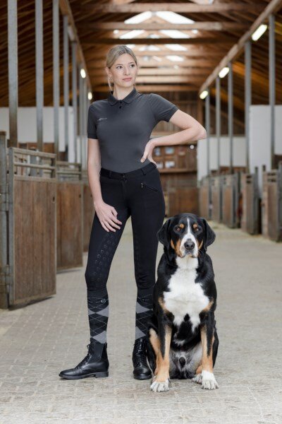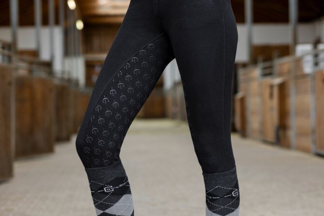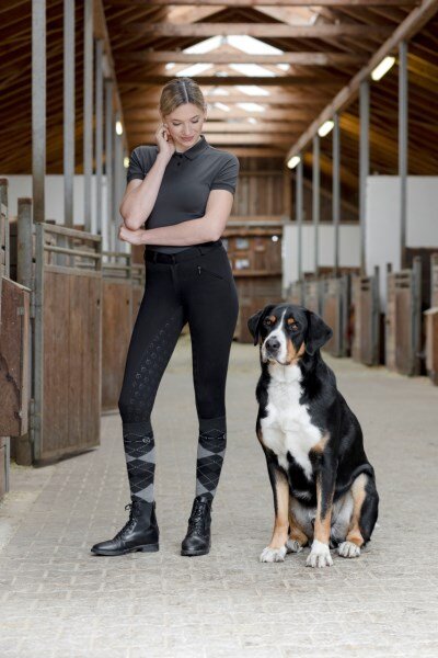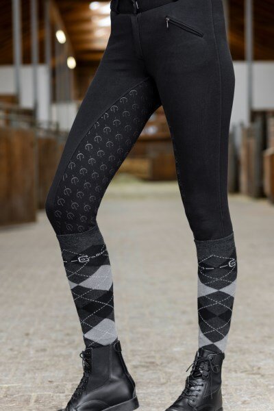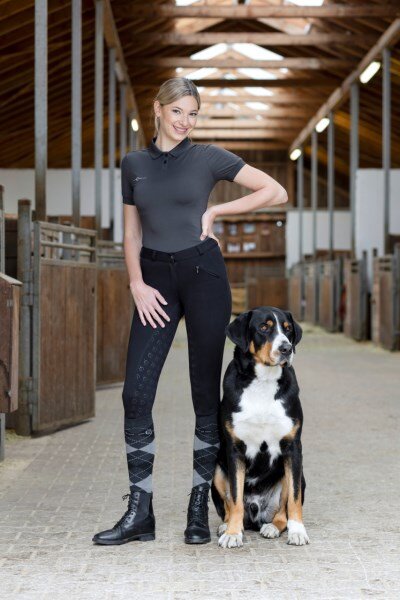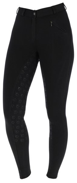 Dámské jezdecké bavlněné kalhoty se silikonovým potiskem po celé délce, poutky pro opasek, jednou přední kapsou na zip.