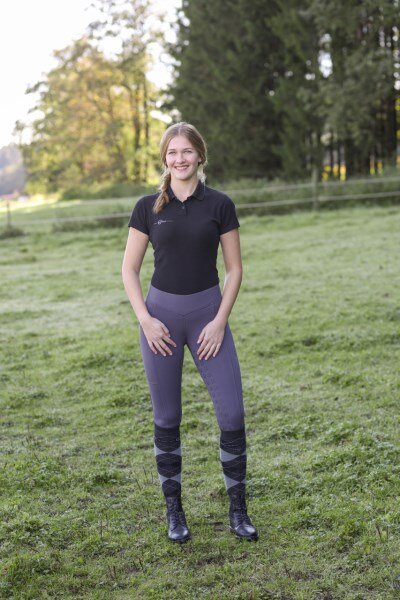 Dámské jezdecké legíny se středně vysokým pasem z utra elastického mikrovlákna s extra širokým pohodlným pasem, praktickou kapsičkou na mobil a silikonovým potiskem po celém sedu ve tvaru loga Covalliero.• leginy z ultra elastického materiálu