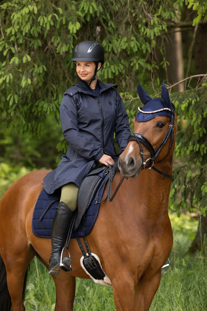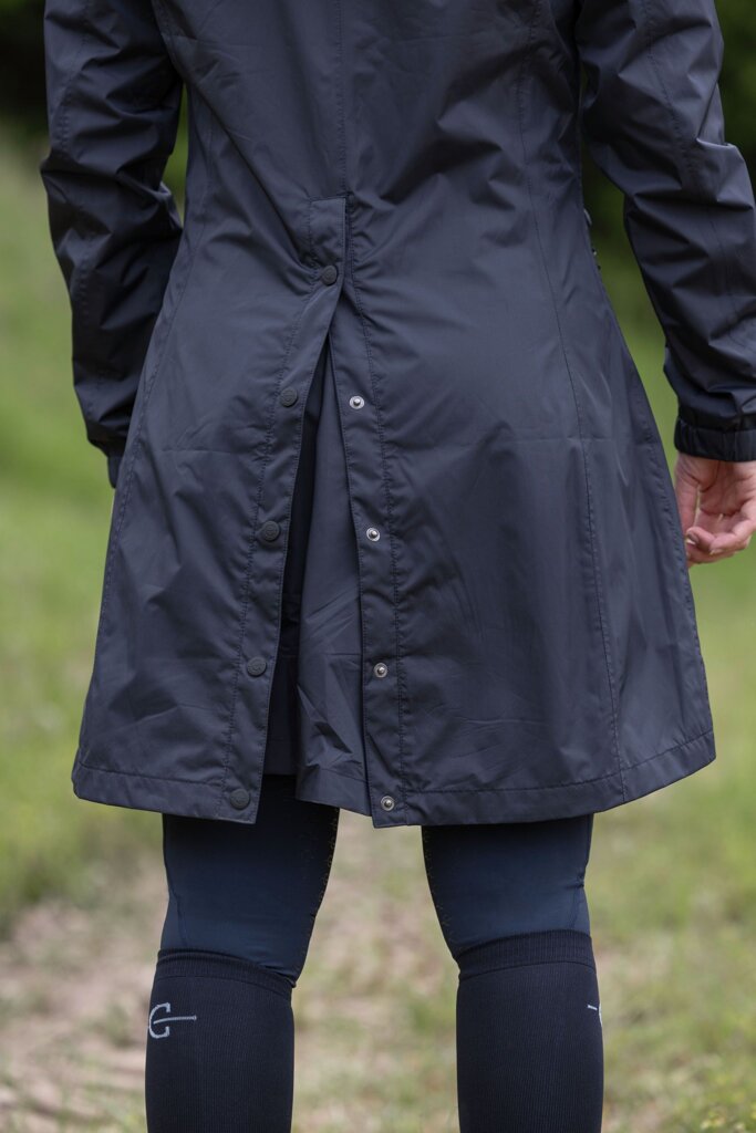 Lehký, sportovní, jezdecký kabát s vypasovaným střihem, odnímatelnou kapucí, která se dá vepředu zapnout na 2 druky a tvoří kryt přes vysoký límec. Obousměrný zip a rozparek v zadní části se zapínáním na druky zajistí maximální pohodlí v sedle. Po stranách jsou 2 kapsy se zapínáním na klasický zip. Rukávy jsou zakončeny manžetou s gumou. Vše doladí logo Covalliero přední straně.