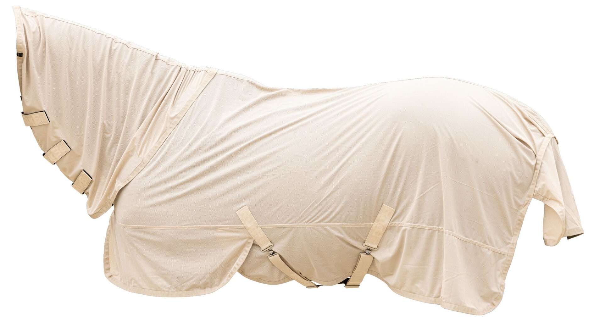 Lehká síťovaná deka proti hmyzu z měkkého polyesterového materiálu se zapínáním na přezky a suchým zipem na prsou, odnímatelným krkem, nastavitelným křížovým zapínáním pod břichem a chráničem ocasu.