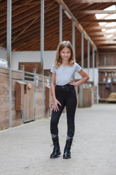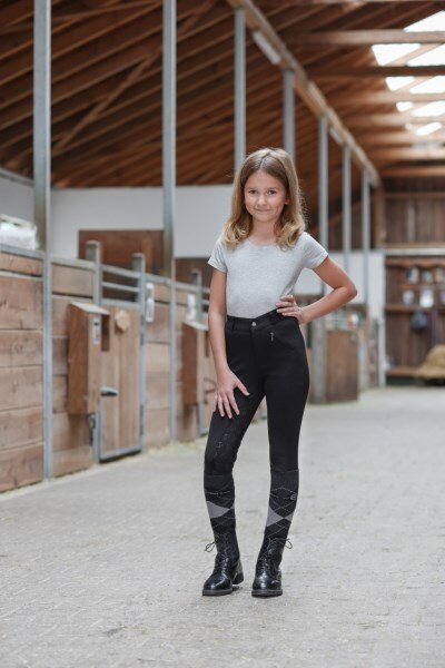 Dětské jezdecké bavlněné kalhoty se silikonovým potiskem po celé délce, poutky pro opasek, jednou přední kapsou na zip.• vysoký komfort nošení díky materiálu z organické bavlny