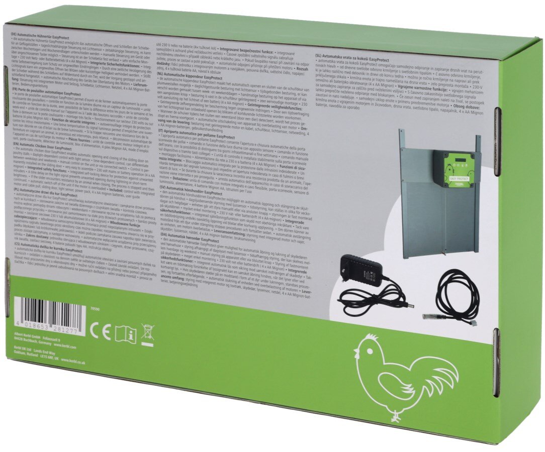 Az Easy Protect automata ajtó hatékony védelmet nyújt a baromfiak számára azáltal, hogy automatikusan nyílik és záródik a nappali fényviszonyok vagy egy beállított időpont szerint. Megbízhatóan védi a tyúkólat az éjszakai ragadozóktól, és sokkal könnyebbé teszi a baromfi napi gondozását.