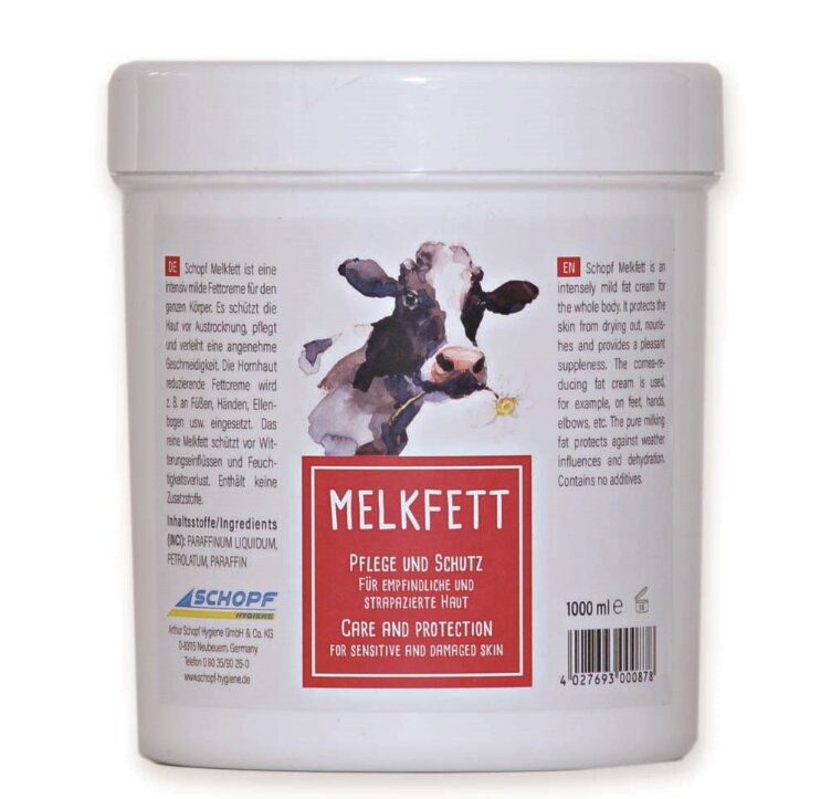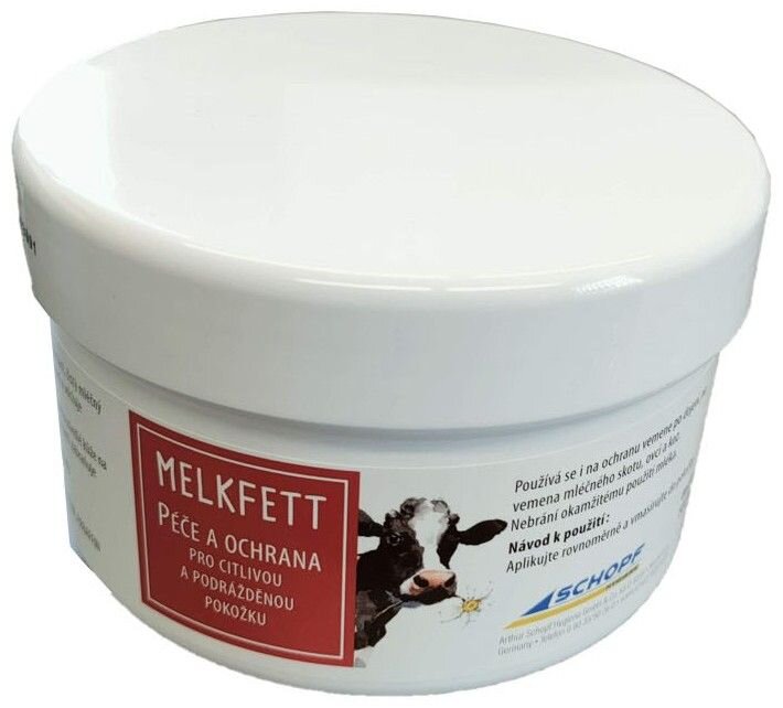 MELKFETT je přírodní mléčný tuk pro péči o vemeno, který se stále častěji používá také při péči o lidské tělo. Chrání pokožku před dehydratací a udržuje ji vláčnou. Je velmi účinný k odstranění mozolů a ztvrdlé kůže na dlaních či chodidlech, loktech a zároveň zabraňuje jejich opakované tvorbě.