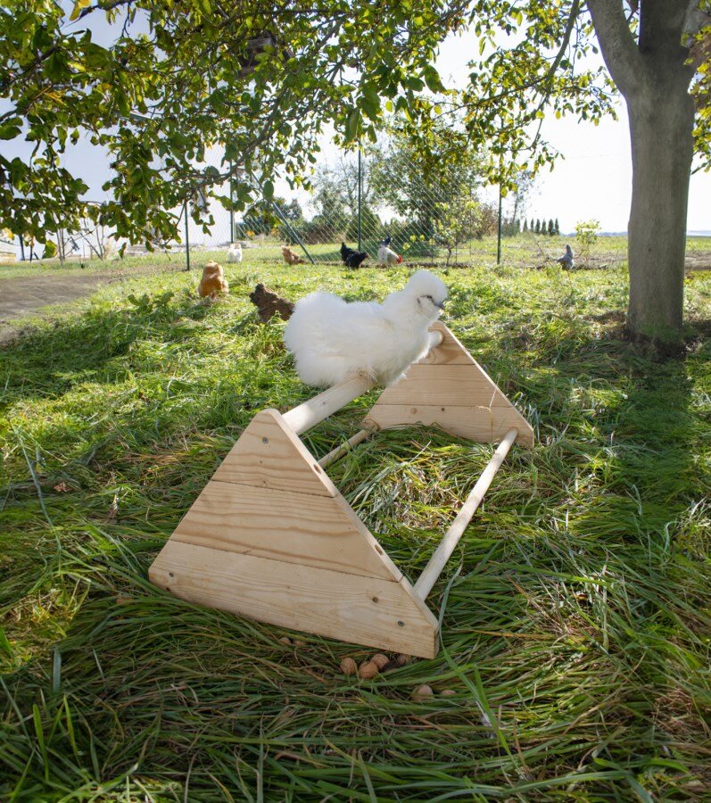 Masszív, fából készült ülőruda tyúkok és csirkék számára, amely elősegíti természetes ülőruházásukat. Kényelmes és biztonságos helyet biztosít az állatoknak az ólban vagy a kifutóban való üléshez.
