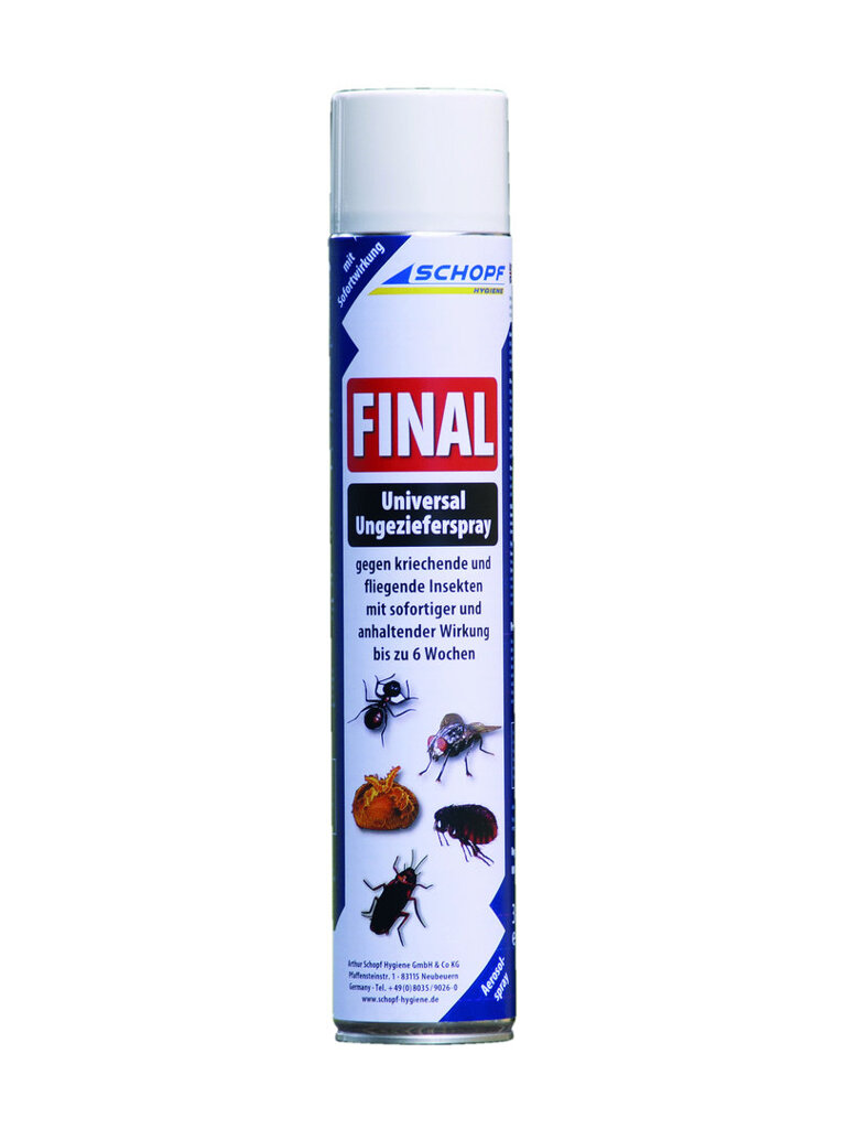 Final Universal Ungeziefer Spray je univerzální sprej proti lezoucímu a poletujícímu hmyzu s okamžitým a dlouhotrvajícím účinkem až po dobu 6 týdnů. Používá se proti mravencům, mouchám, švábům, roztočům, klíšťatům, blechám, molům a broukům. Final Universal Ungeziefer Spray je vynikajícím prostředkem i na vnější ochranu zvířat.