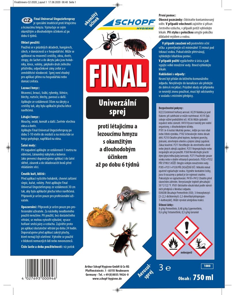 Final Universal Ungeziefer Spray je určen proti lezoucímu a poletujícímu hmyzu.