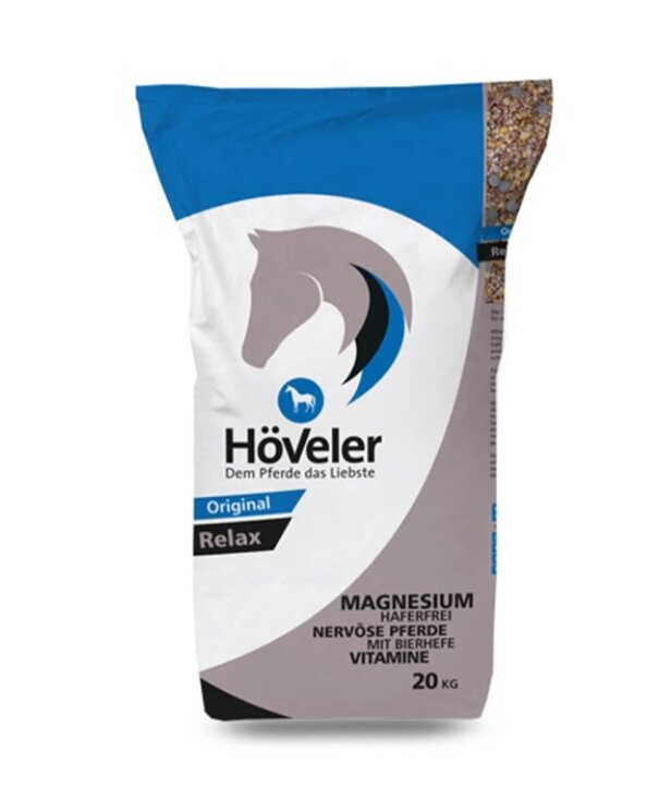 Höveler Relax je bezovsová směs se střední koncentrací energie a bílkovin pro nervózní koně. Toto krmivo jsme vyvinuli na míru koním, u kterých se dají pozorovat přehnané reakce ve stresových situacích. Proto jsme vybrali pouze ty suroviny, které mohou přispět ke zklidnění koní. Kromě toho byly přísady jako je pšenice, ječmen a kukuřice hydrotermálně zpracovány pro zlepšení stravitelnosti. Vzhledem k tomu, že je Höveler Relax plně vitaminizován a mineralizován, lze jej podávat samostatné krmivo.
