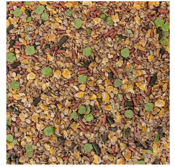 Kukuřičné vločky, ječné vločky, pšeničné vločky, pšenice, pšeničné otruby, 6 % moučka z vojtěšky, 5,5 % hrachové vločky, 2,5 % kousky rohovníku, ječmen, uhličitan vápenatý, řepná melasa, 1,5 % lněný olej, oxid hořečnatý, chlorid sodný, fosforečnan vápenatý, pivovarské mláto, pivovarské kvasnice