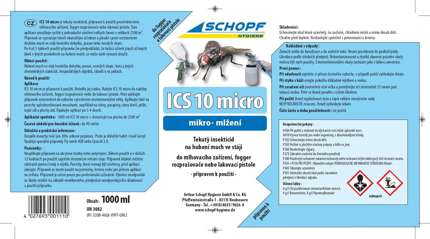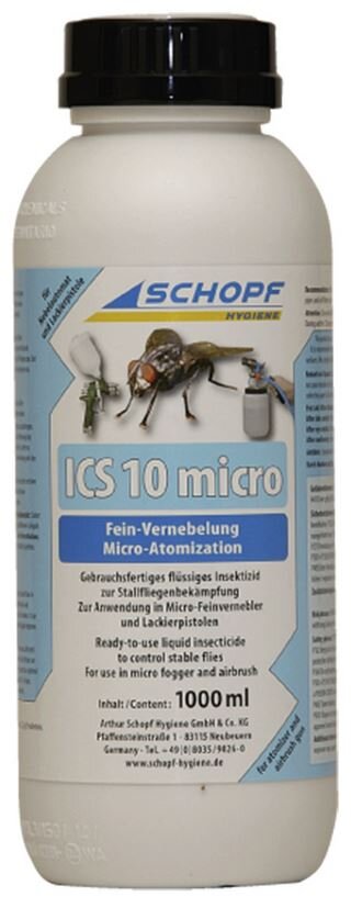 ICS 10 micro je tekutý insekticid, připraven k použití prostřednictvím micro-rozprašovače nebo lakovací pistole. Tato aplikace umožňuje rychlé a jednoduché ošetření velkých farem o velikosti 2500m2. Přípravek se vyznačuje okamžitým účinkem a působí i proti rezistentním druhům much ve stáji hovězího dobytka, prasat nebo nosných slepic. Po 4 až 5 týdnech použití přípravku lze předpokládat, že hubicí účinek jiných účinných látek v jiných produktech na hubení much, se může opět výrazně zlepšit.