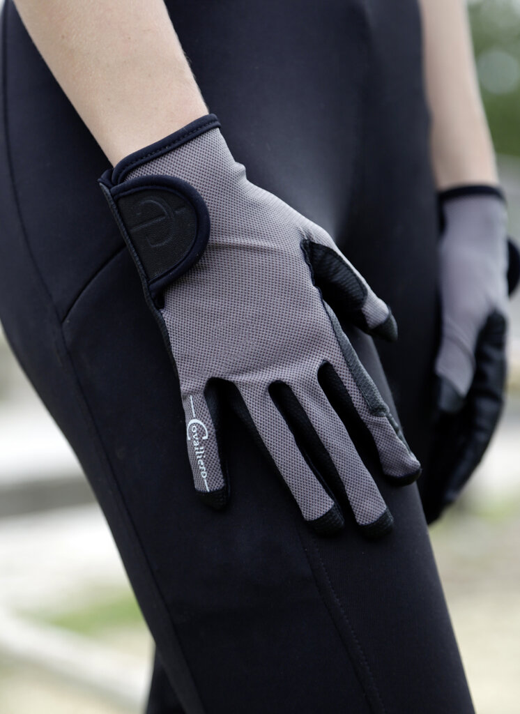 Letní vzdušné jezdecké rukavice z prodyšného materiálu, který zajišťuje optimální ventilaci. Díky svému střihu a přilnavosti perfektně sedí na ruce.