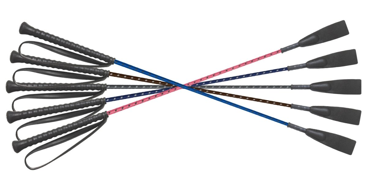 Klasický jezdecký bičík s barevným nylonovým opletem, gumovou rukojetí, poutkem a zakončen plácačkou, Díky poutku je bičík vhodný pro začátečníky.