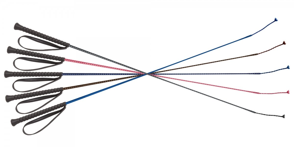 Klasický jezdecký bičík s barevným nylonovým opletem, gumovou rukojetí, poutkem a zakončen šlahounem, Díky poutku je bičík vhodný pro začátečníky.