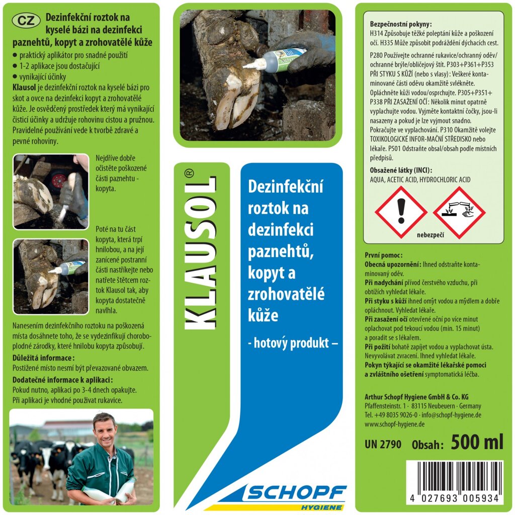 - Klausol je dezinfekční roztok na kyselé bázi pro hovězí dobytek a ovce na dezinfekci paznehtů, kopyt a zrohovatělé kůže.