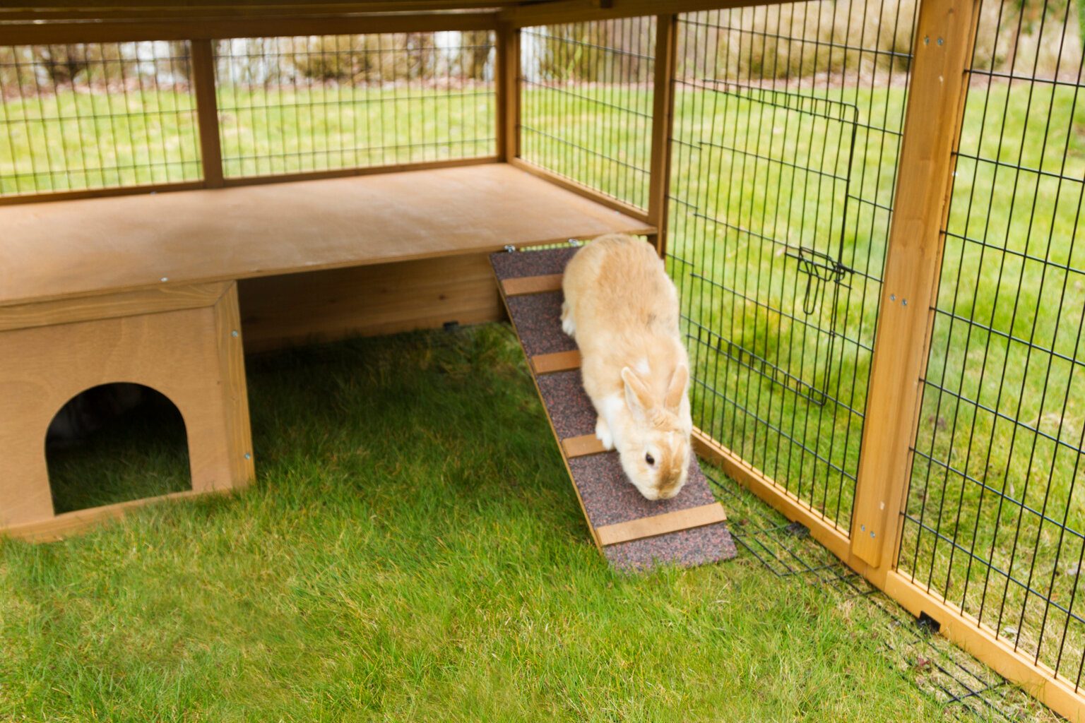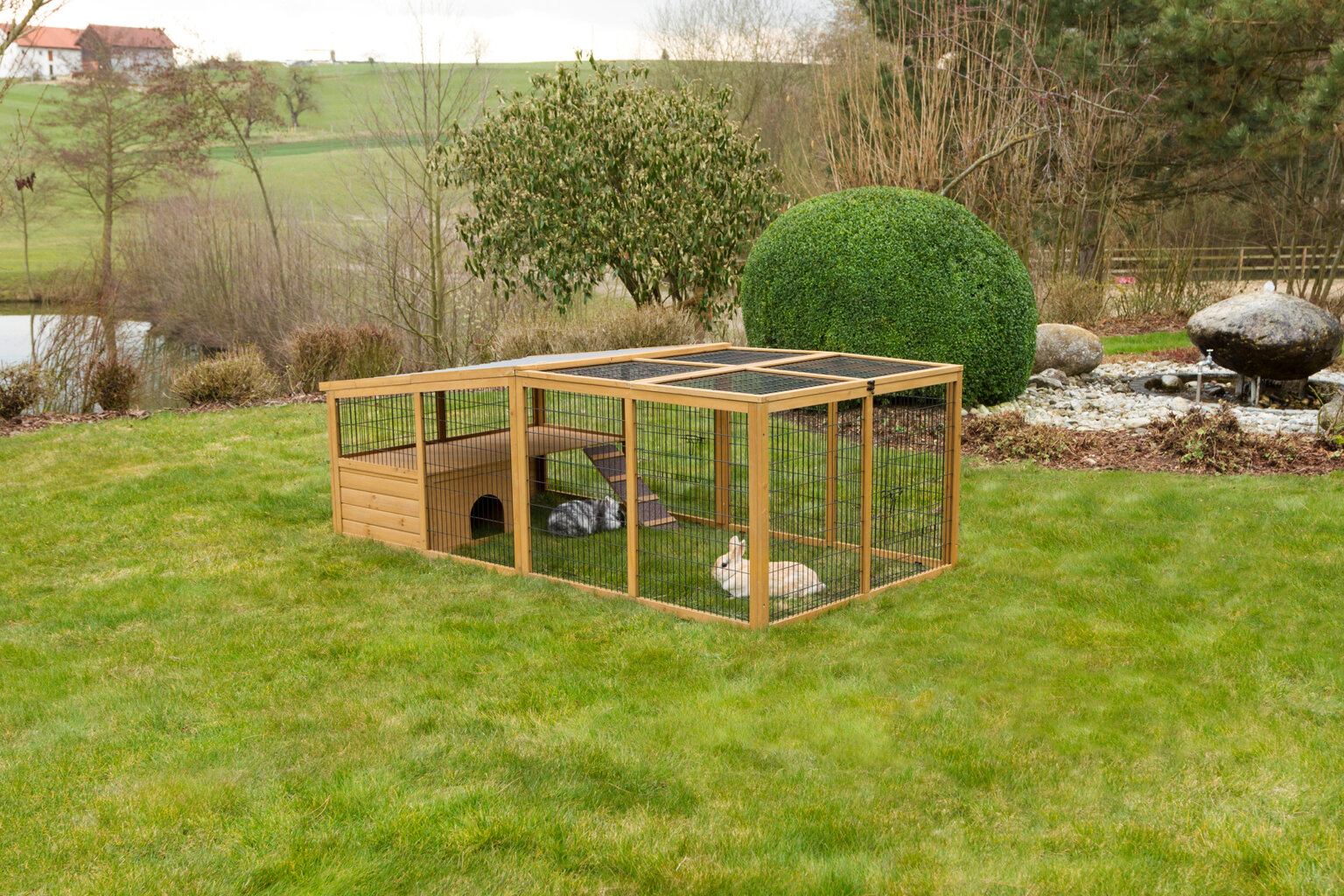 Prostorná venkovní králíkárna vhodná pro králíky, morčata nebo další malá zvířata. Nabízí velký otevřený výběh a praktickou otevírací střechu, která usnadňuje péči o zvířata.