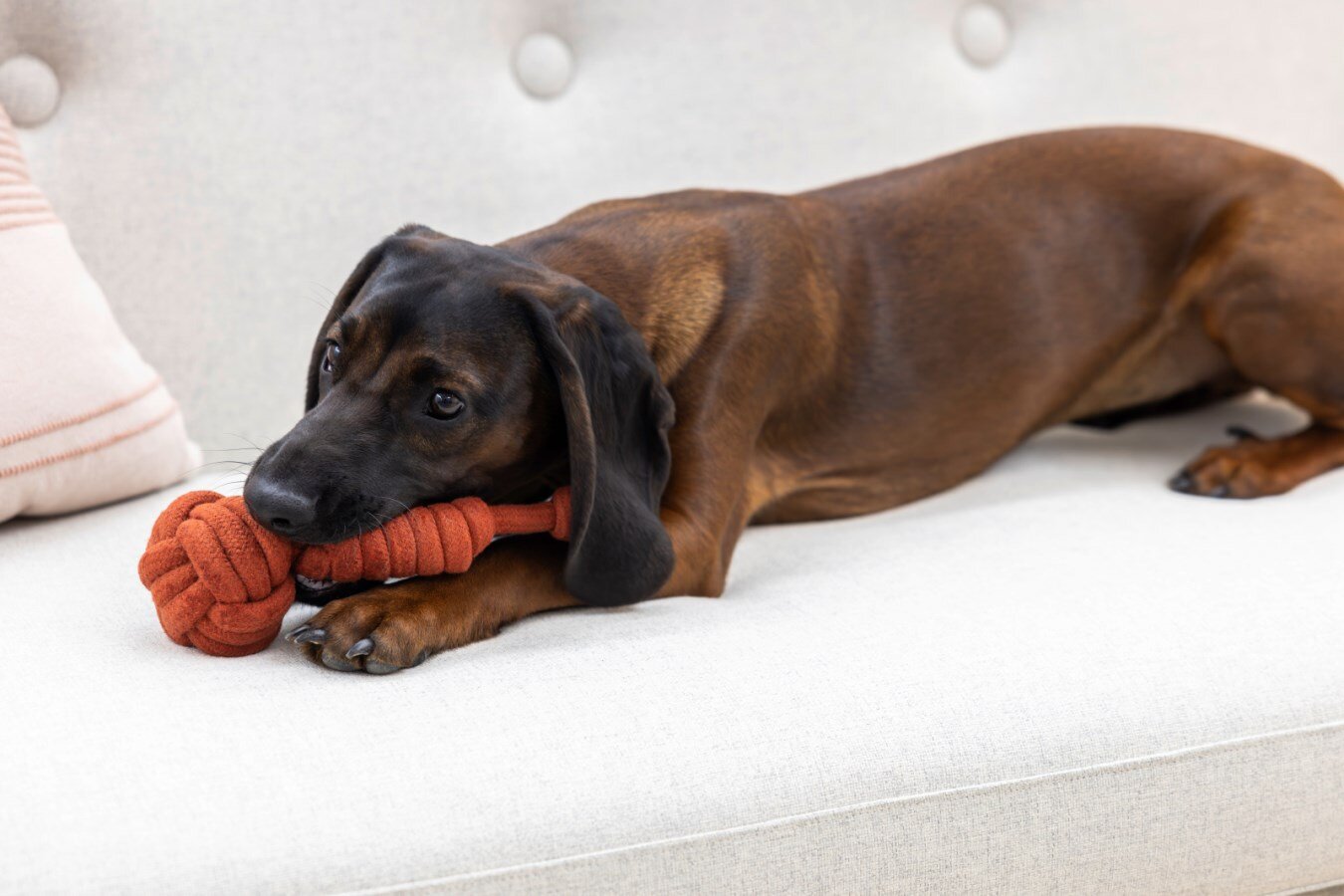 Odolná lanová hračka pro psy ve tvaru míče s pevným lanem je skvělá pro aportování i přetahování. Vyrobená z kvalitního bavlněného lana, které odolává kousání a zároveň pomáhá čistit zuby a masírovat dásně.