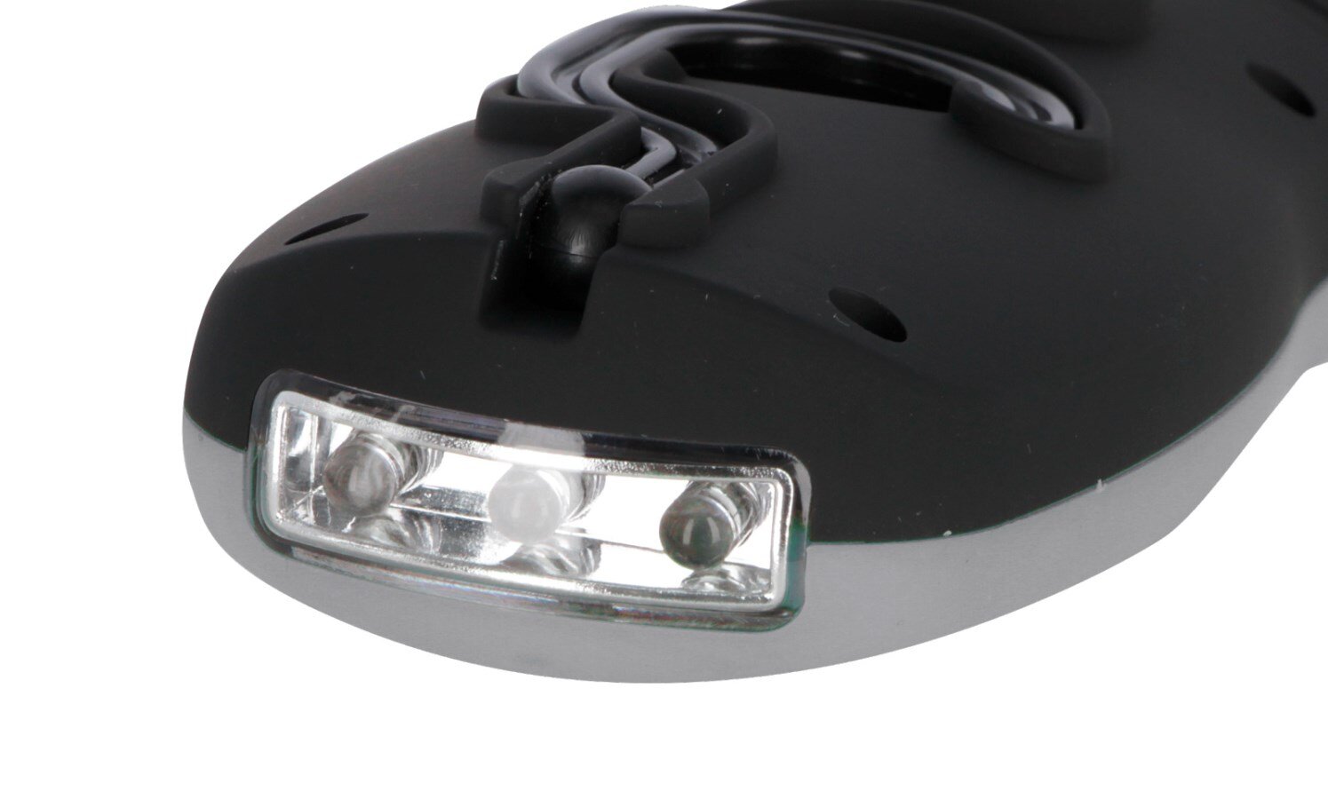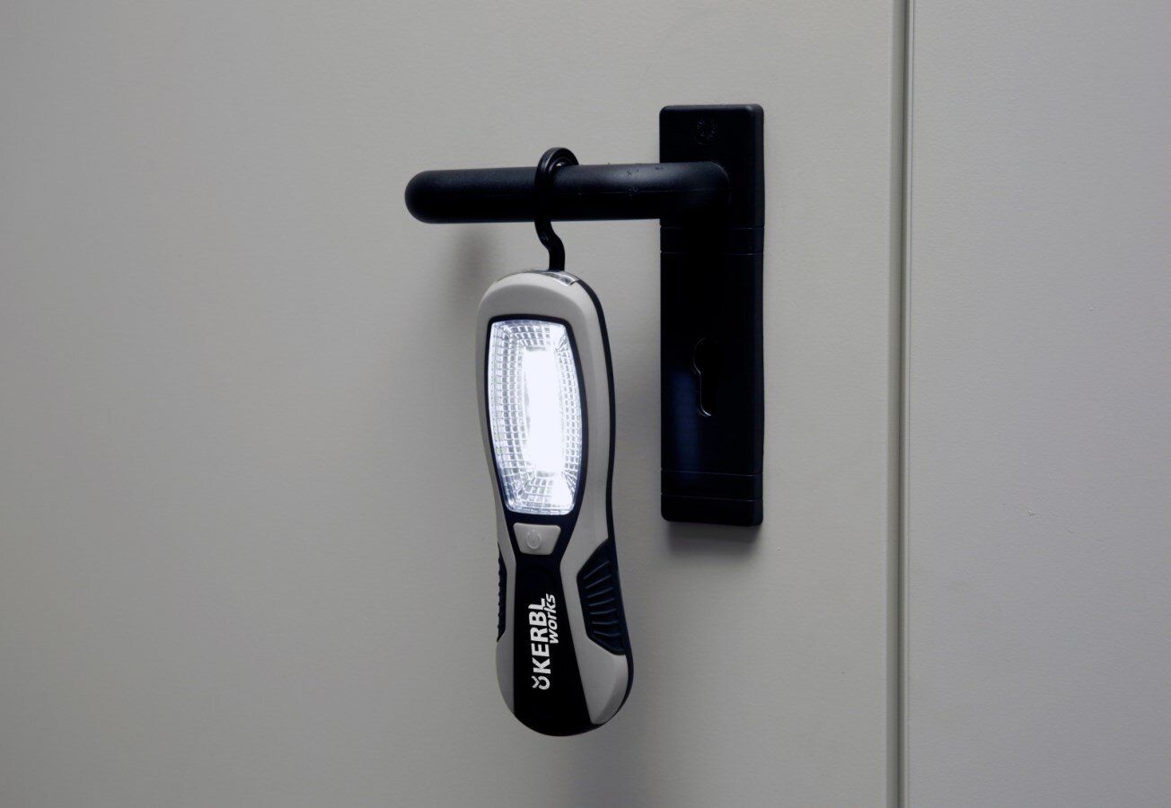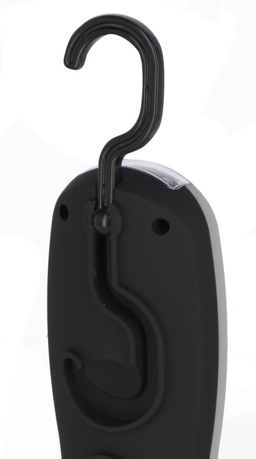 Další tři LED diody umístěné v hlavě svítidla umožňují úsporný a cílený provoz, například při detailní práci. Díky výklopnému háčku otočnému o 360° a magnetu na zadní straně lze svítilnu snadno upevnit nebo zavěsit podle potřeby.