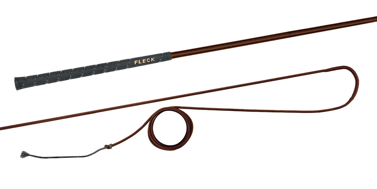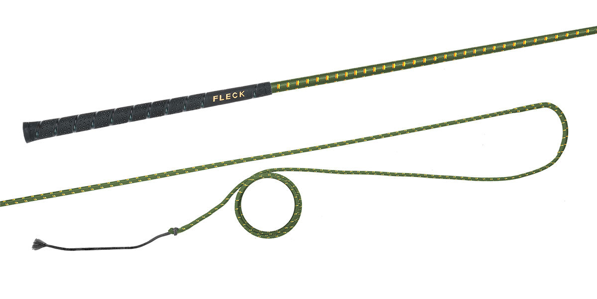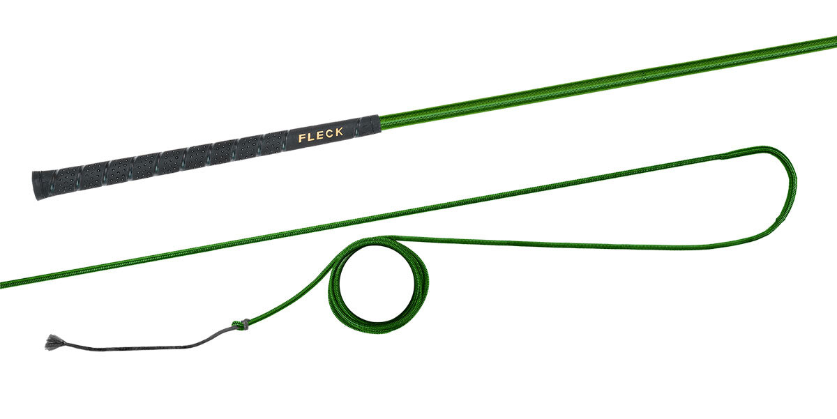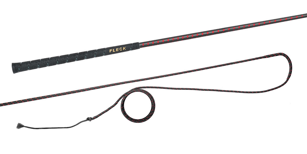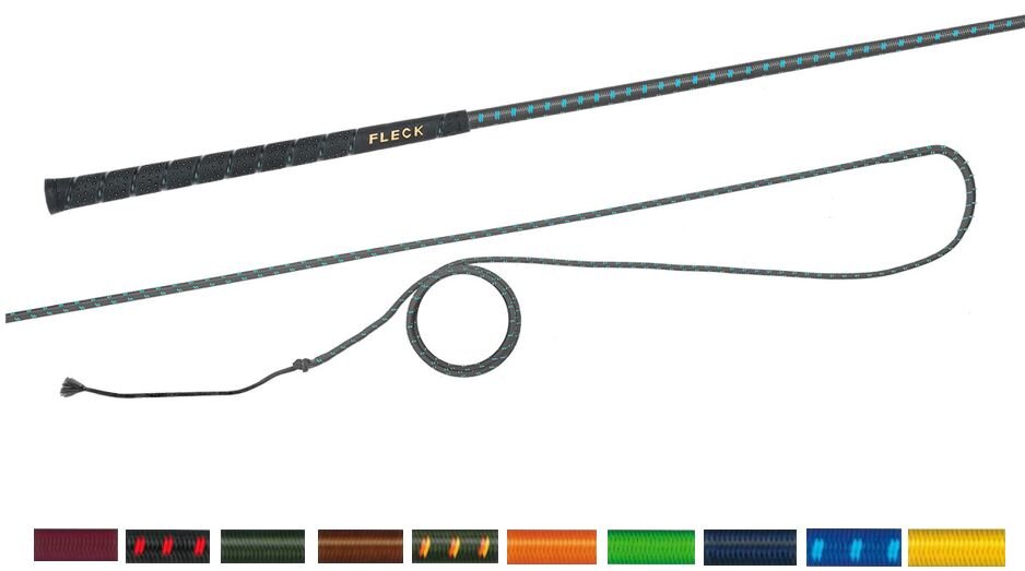Lonžovací nedělený bič s barevným nylonovým opletem s neklouzavou a do ruky příjemnou FLECK-grip rukojetí.