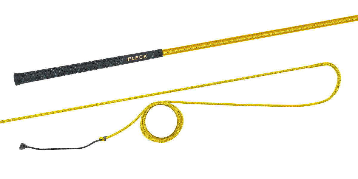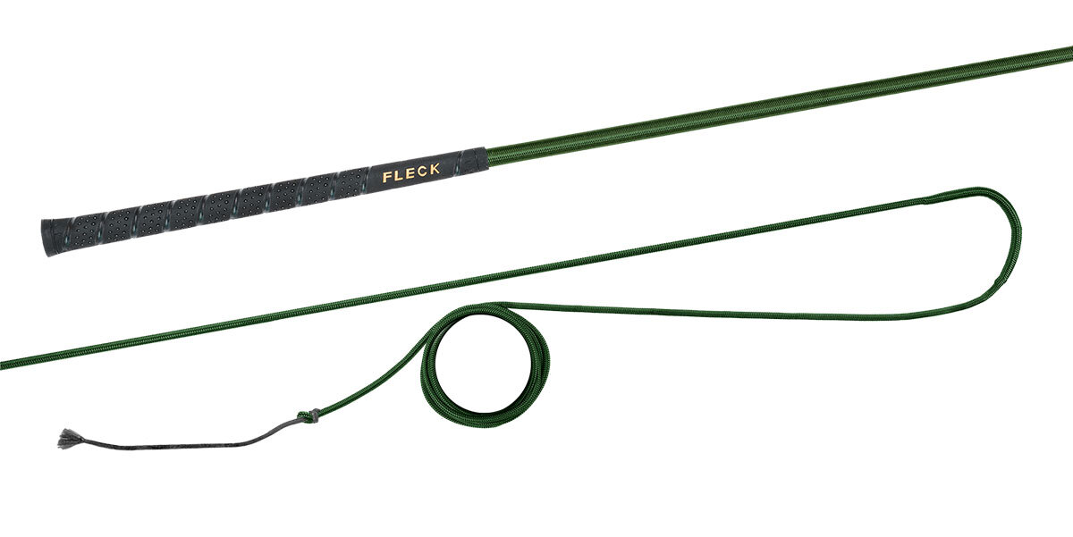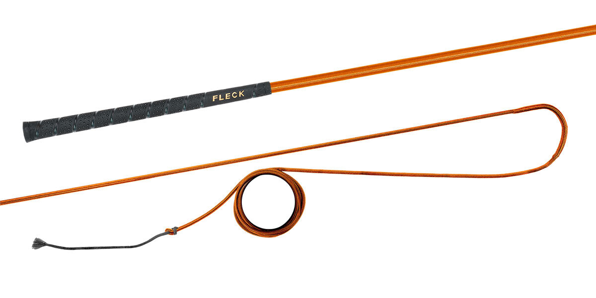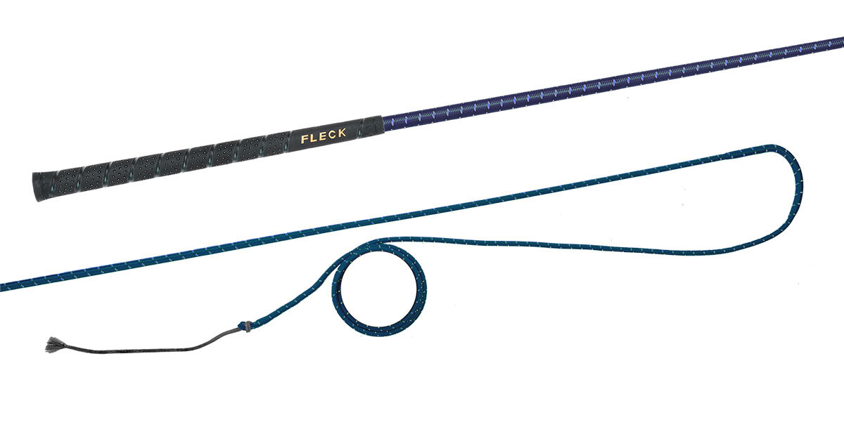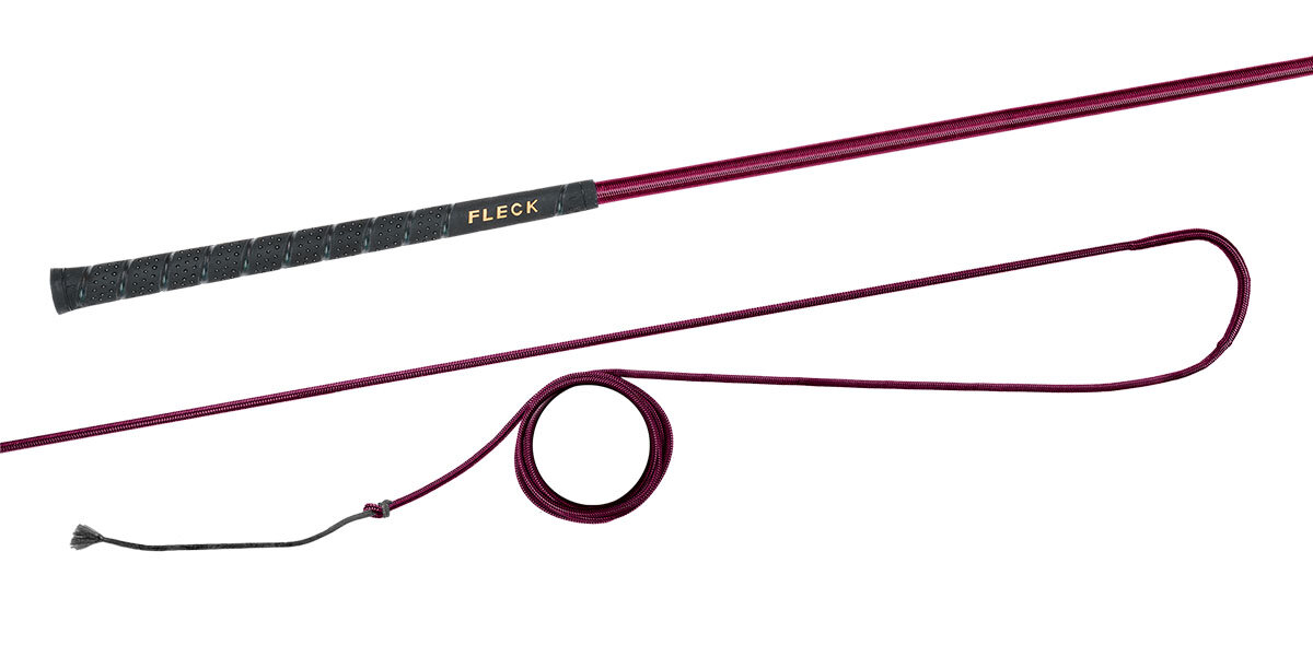 Lonžovací nedělený bič s barevným nylonovým opletem s neklouzavou a do ruky příjemnou FLECK-grip rukojetí.