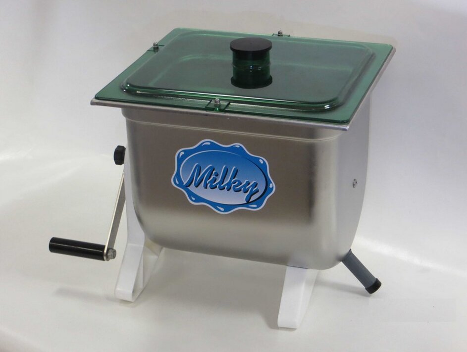 M- Máselnice ruční FJ10, 10 litrů Malá a příruční ruční máselnice, která vyřeší problémy se stloukáním másla doma. Všechny díly, které přijdou do kontaktu se smetanou, jsou zhotoveny z nerezové oceli a velmi snadno se proto udržují. Pokud chcete dosáhnout optimální kvality másla, naplňte mísu o objemu 10litrů pouze 1-4 litry smetany. Pomocí velkého průhledného víka můžete stále sledovat výrobní proces. Po ukončení výroby másla lze pomocí výpustného kohoutu snadno vypustit podmáslí.Zákazníci hodnotí