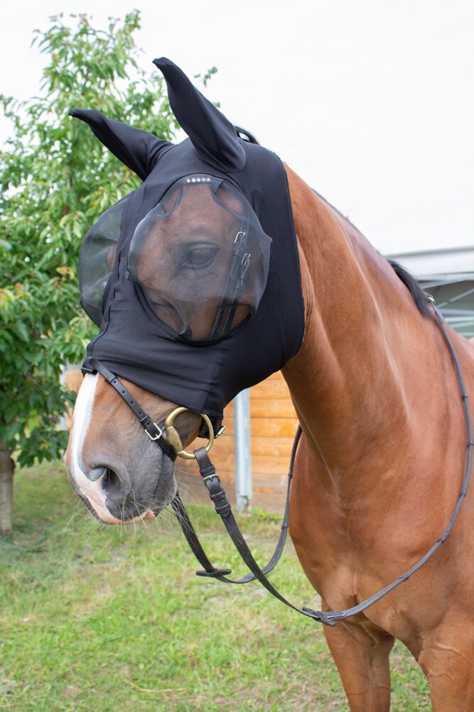 Jezdecká maska proti hmyzu určená pro nasazení na uzdečku z příjemného elastického materiálu - lycry. Otvory na oči z velmi pevné síťoviny, která na ně nelehá.