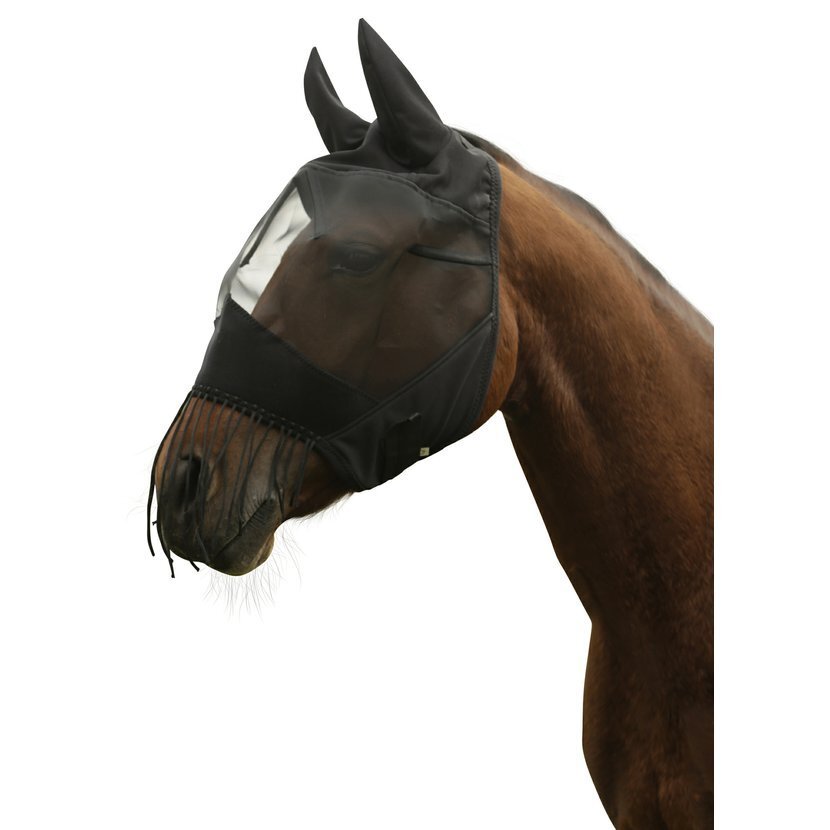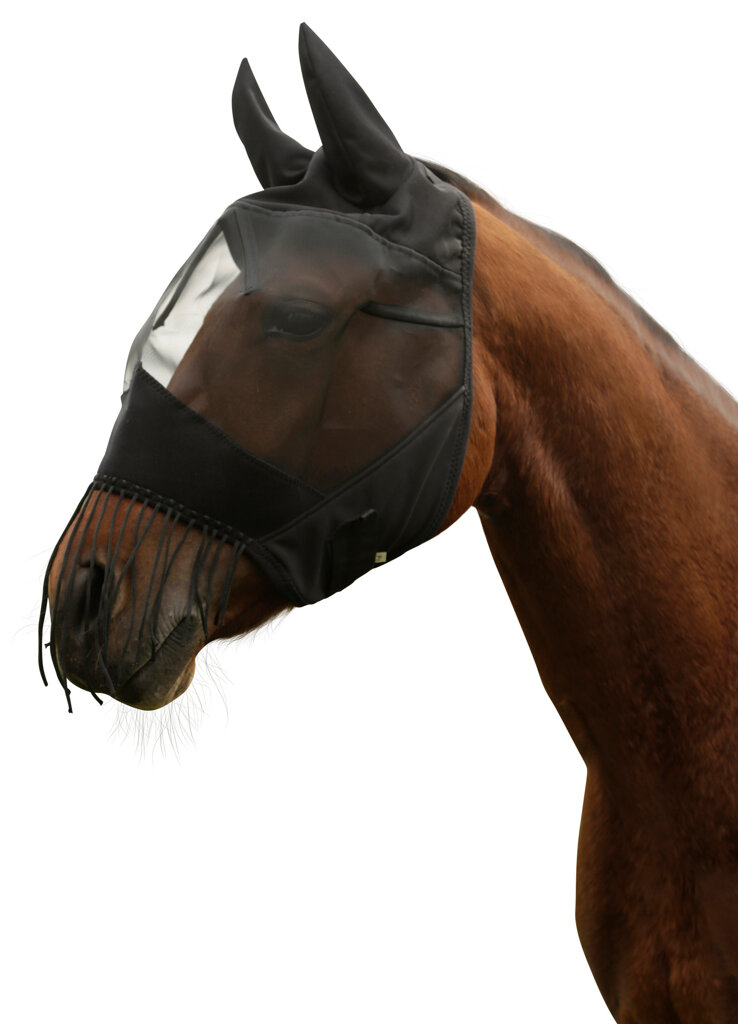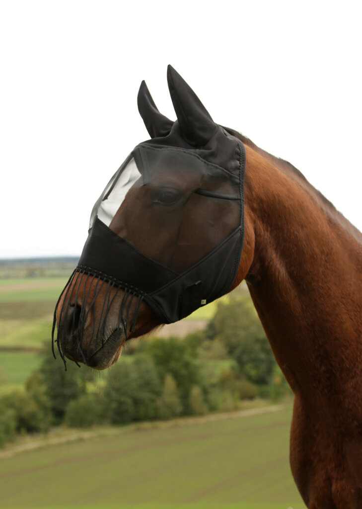 Maska proti mouchám s ochranou uší a šňůrou na ochranu nozder.• s třásněmi k odhánění much a jiného hmyzu z citlivé oblasti nozder
