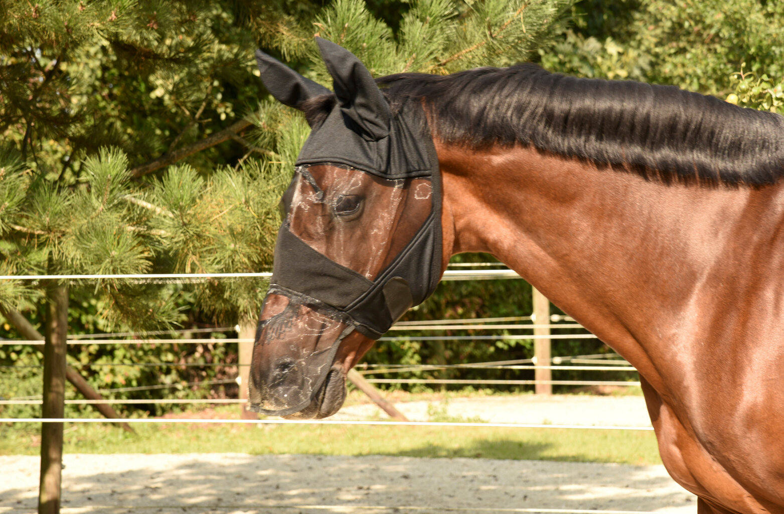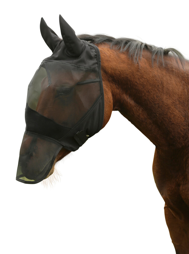 Maska proti mouchám s ochranou uší a nozder• vypracovaná ochranná část pro část kůže mezi nozdrami a očima