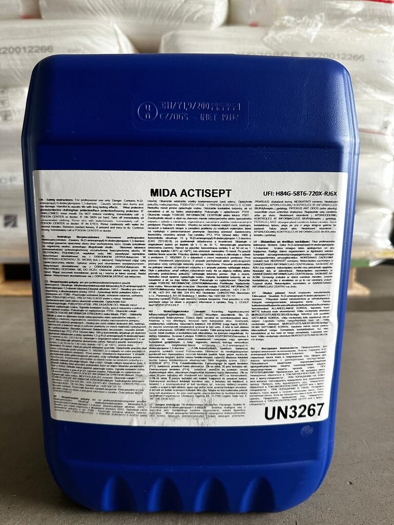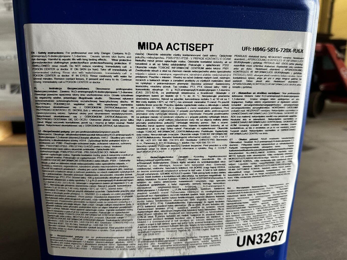 MIDA ACTISEPT je slabě alkalický, nízce pěnivý prostředek bez obsahu chlóru. Jeho účinnou dezinfekční složkou jsou alkylaminacetáty – moderní látky s vynikajícím dezinfekčním účinkem a zároveň výrazně nižší korozivitou než tradičně používaný chlornan sodný. Díky tomu nehrozí poškození plastů, nerezové oceli ani dalších citlivých povrchů.