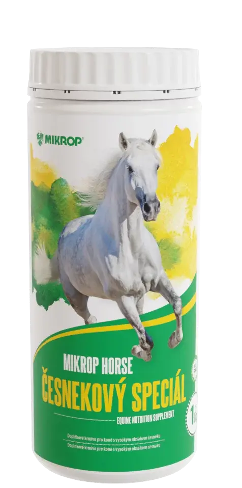 Doplňkové krmivo s vysokým obsahem česneku pro koně a jiná zvířata, zlepšuje příjmem potravy, trávení a resorpci živin.