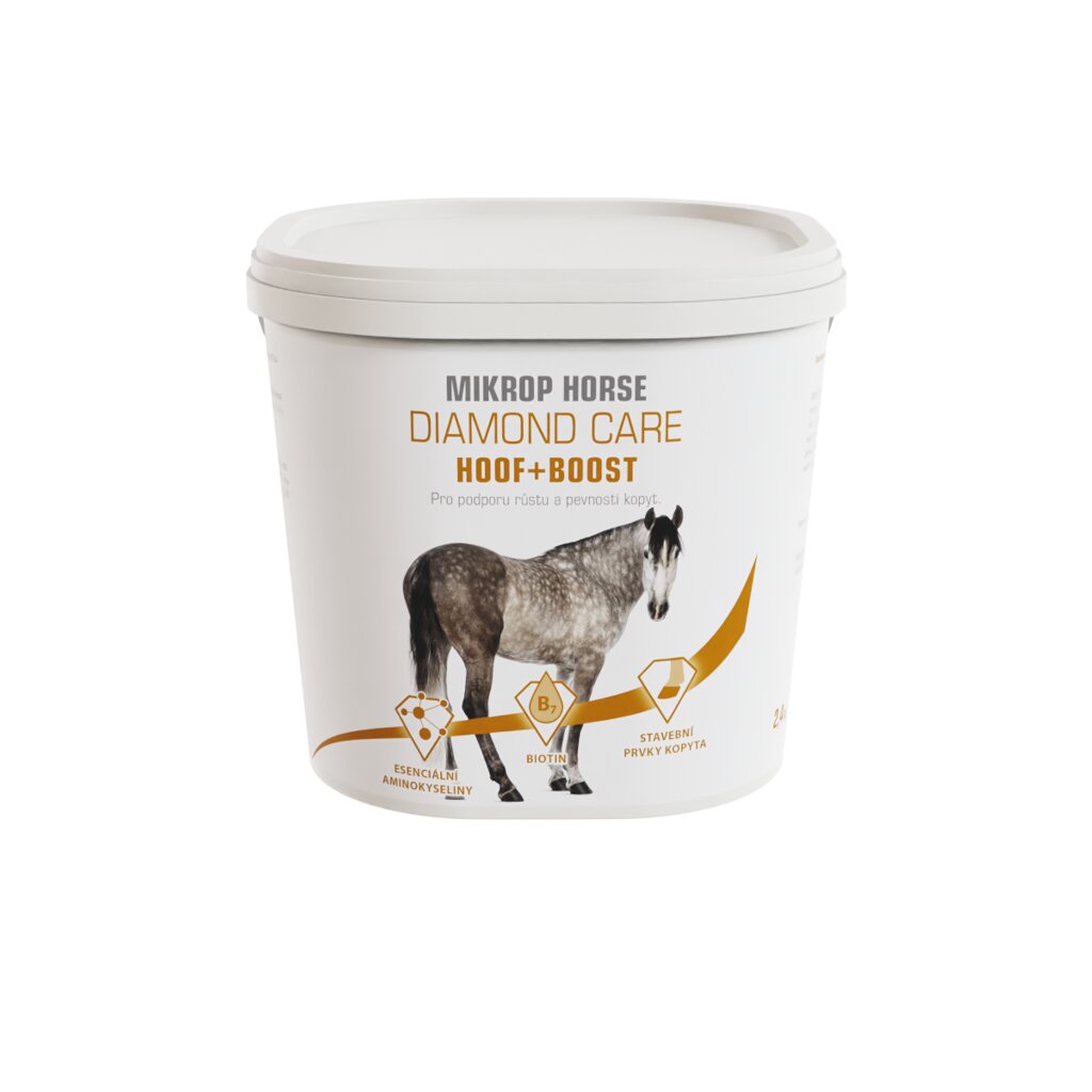 MIKROP® HORSE DIAMOND CARE HOOF+BOOST je doplňkové krmivo pro koně se zvýšeným obsahem biotinu, zinku a esenciálních aminokyselin pro podporu růstu a vitality kopytní rohoviny.