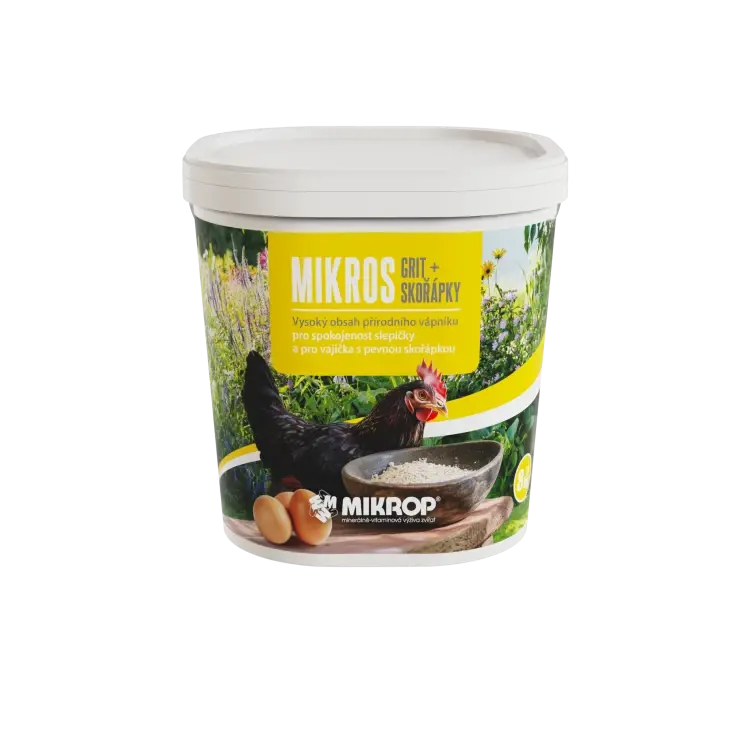 Krmný návod: Mikros Grit + Skořápky přidávejte volně k dispozici drůbeži. Případně můžete přimíchávat do krmiva dle potřeby: nosnice cca 5 – 7 %, mladá drůbeže (nad 6 týdnů) cca 2 – 4 % a u brojlerů cca 1 – 3 %. Každopádně by měl být také volně k dispozici v krmítku, aby si mohla drůbež sama regulovat příjem. Zabezpečte dostatečné množství pitné vody.