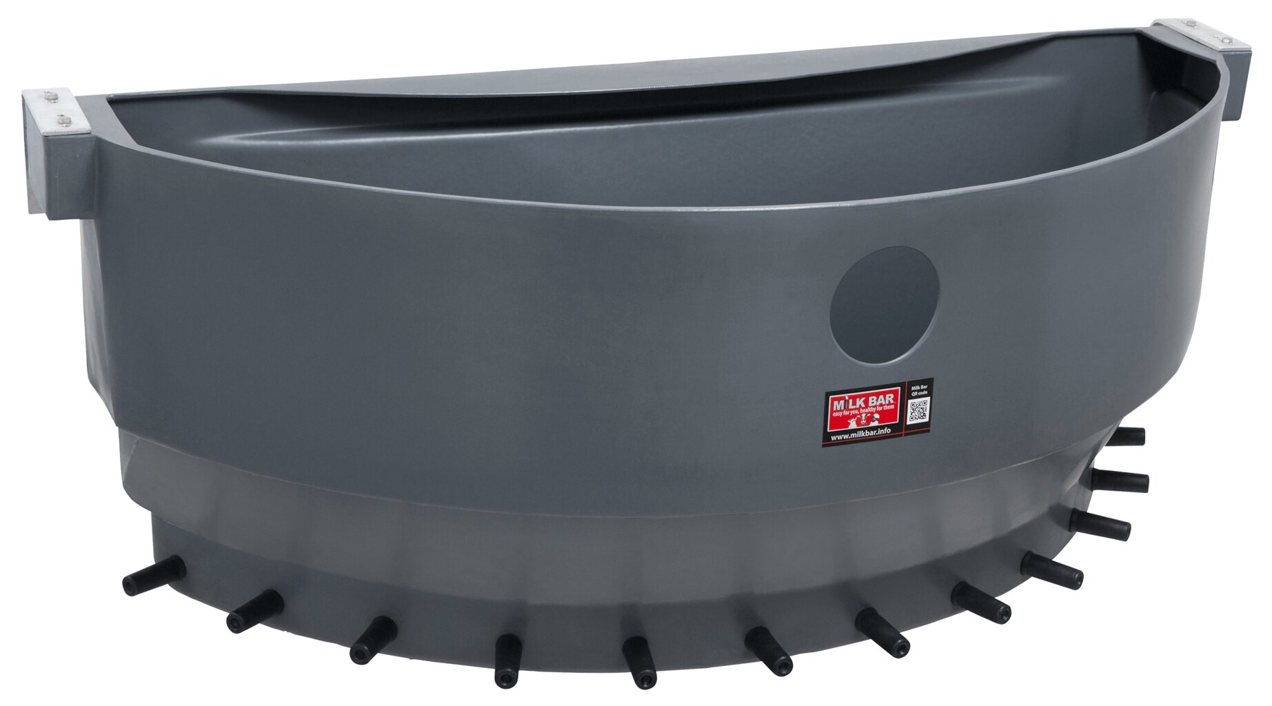 Milk Bar™ 12 je robustní krmítko navržené pro efektivní krmení až dvanácti telat současně. S objemem 90 litrů a hmotností 8 kg je ideální pro větší skupiny telat. Ergonomický design s předním výřezem a zadní hranou usnadňuje manipulaci a snižuje námahu při zvedání krmítka z ohrádky, což minimalizuje zatížení zad obsluhy. Krmítko je vybaveno pevnými hliníkovými háčky, které lze přizpůsobit pro upevnění na brány o šířce 25–32 mm. Použití dudlíků Milk Bar™ s kontrolovaným průtokem mléka podporuje přirozené sání, zlepšuje trávení a snižuje nežádoucí sání mezi telaty.