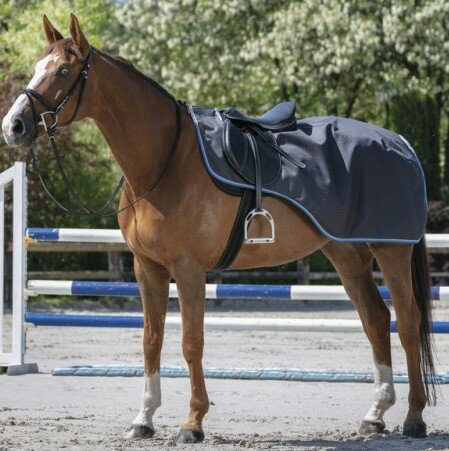 Nepromokavá bederní deka podšitá fleecem z vysoce odolného rip-stop materiálu 1200 Denier. Bederka se snadno zapíná na kohoutku širokým suchým zipem, v přední části je zúžená pro lepší kontakt s koněm.