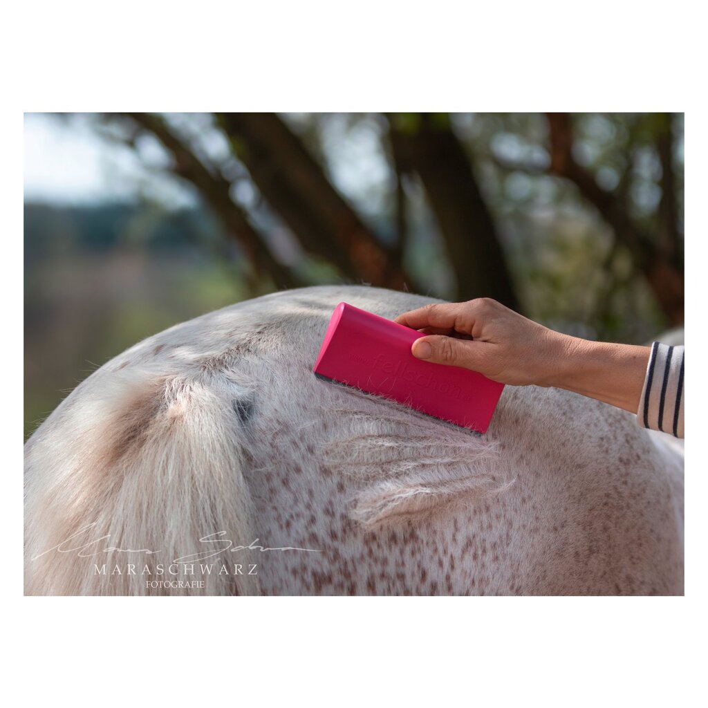 Absolutní špička v odstraňování staré odumřelé srsti. Jeho klínovitý tvar umožňuje bezpečnou a pohodovou práci. Ruka se tolik neunaví jako u klasických pomůcek pro odstranění srsti. Jemně broušené kovové zuby jemně kloužou po srtsti. Volné chlupy, hrubá nečistota a zaschlý pot ze srtsi se vyčesávají bez námahy. Broušené kovové hrany při kartáčování stimulují krevní oběh a růst nové srsti, aniž by poškosily citlivou kůži. Další výhodou je, že se do kartáče chlupy nezachytávají, takže není potřeby jej složitě čistit. Rukojeť je vyrobena z dřevěného odpadu a vysoce kvalitním plastem• špička v odstaňování odumřelé srsti