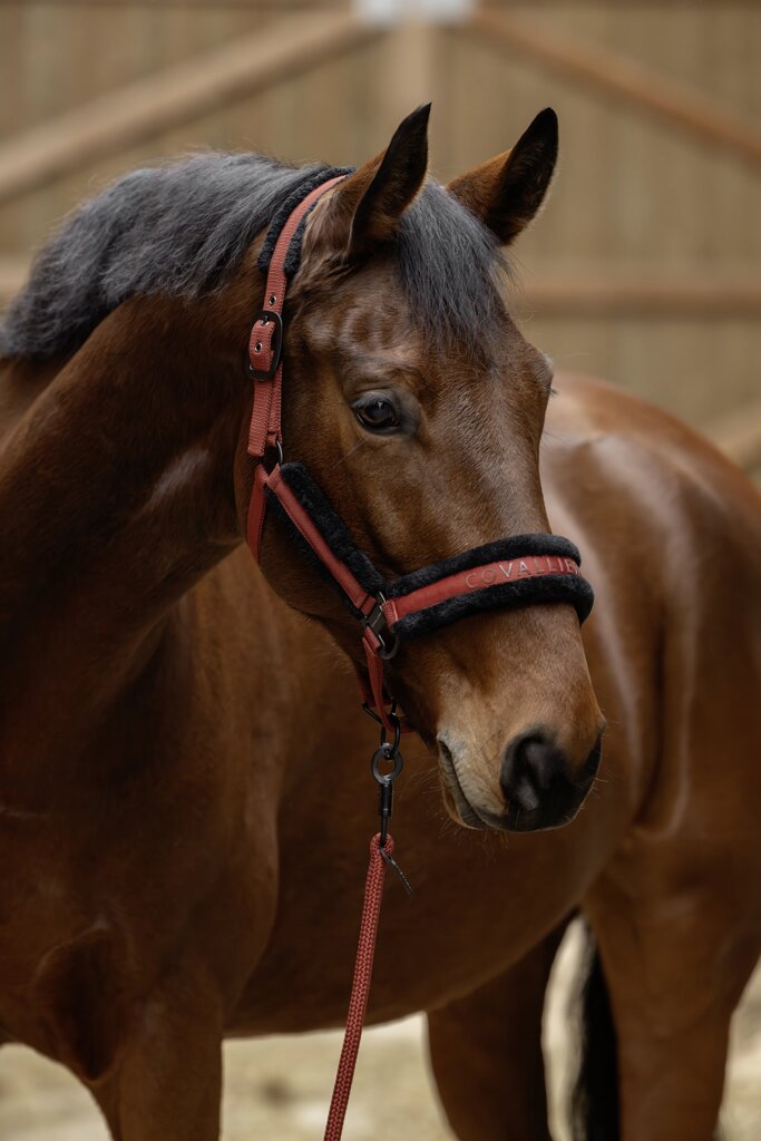 Ohlávka Covalliero je vyrobena z vysoce odolného materiálu se zesílenými švy, které zaručují dlouhou životnost. Měkké polstrování na nánosníku, nátylníku a lícnicích chrání koně před odřením a poskytuje maximální pohodlí.