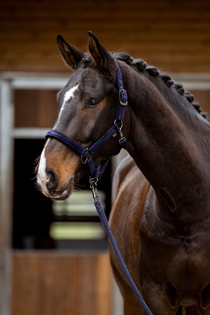 Velmi pevná ohlávka potažena po obou stranách měkkým sametem. Ohlávka perfektně sedne díky možnosti nastavení nátylníku po obou stranách a nastavení okolo nosu. Úžasným detailem ohlávky je pevné, lesklé kování.