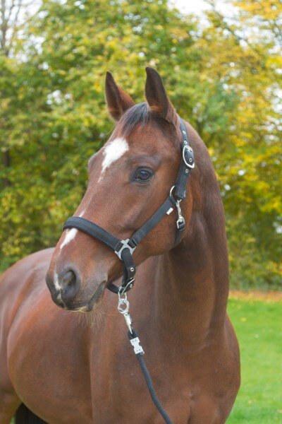 Moderní ohlávka v klasických barvách s možností nastavení nánosníku i nátylníku, podložena fleecem, z pevného materiálu odolnému proti opotřebení se silnými švy a masivním kováním.