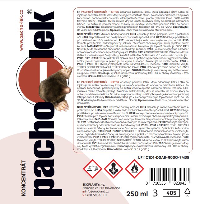 Koncentrát pachové látky proti krtkům – obsahuje účinnou látku, která imituje pach predátora, čímž odpuzuje krtka od rytí a vytváření krtinců na travnatých plochách. Splňuje podmínky zákona č.17/1992 o životním prostředí a dle zákona o biocidech č.324/2016 je vydáno MZ ČR Oznámení o zařazení do seznamu biocidů.
