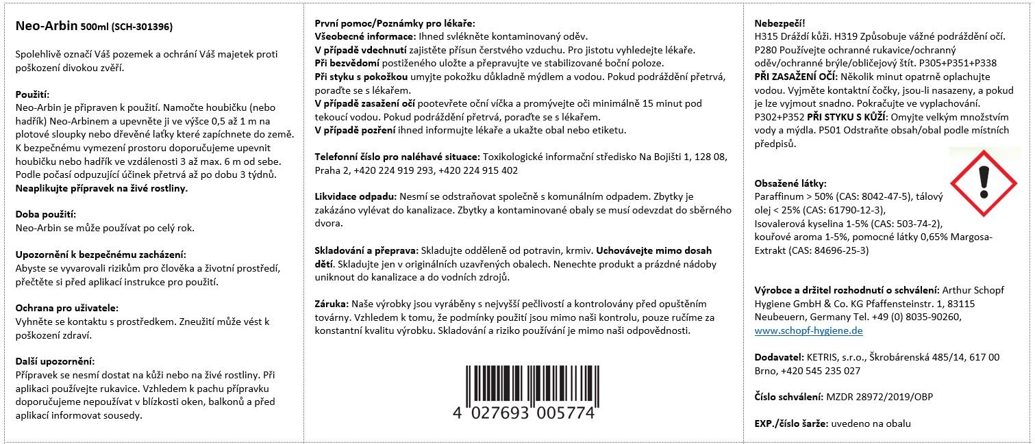 Přípravek se nesmí dostat na kůži nebo na živé rostliny. Při aplikaci používejte rukavice. Vzhledem k tomu, že Neo-Arbin voní nepříjemně i pro lidi, doporučujeme přípravek nepoužívat v blízkosti oken, balkonů a před aplikací informovat sousedy.