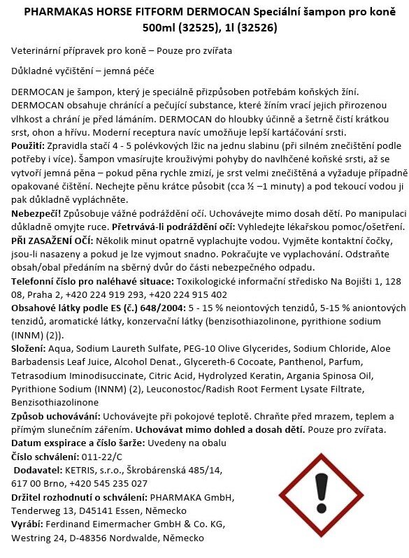 PHARMAKAS Horse fitform DERMOCAN Speciální šampon pro koně• proniká hluboko do srsti, uvolňuje nečistoty a pot, regeneruje srst a kůži