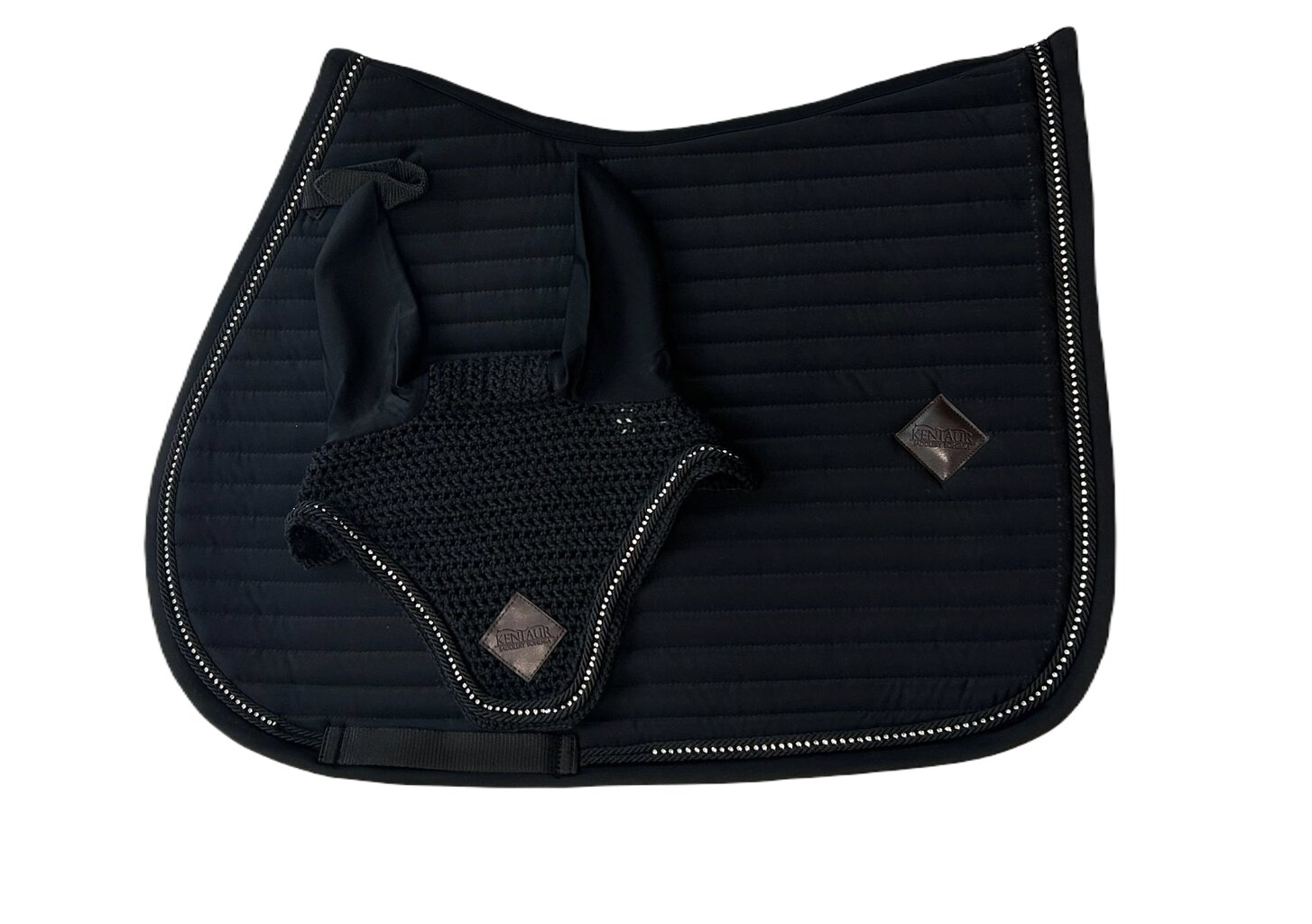 Podsedlová dečka včetně sladěné čabraky na uši s netradičním horizontálním prošitím.