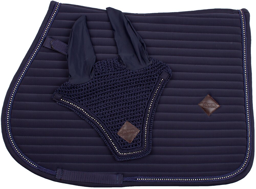 Podsedlová dečka včetně sladěné čabraky na uši s netradičním horizontálním prošitím.