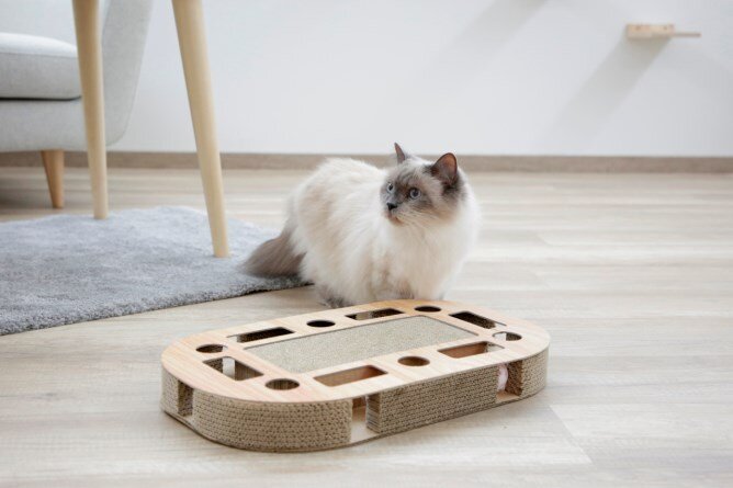 Interaktivní škrabadlo Ovalo je praktickým a stylovým doplňkem pro každou kočku, která si ráda brousí drápky a hraje si. Škrabadlo poskytuje kočkám ideální místo pro přirozené chování, hru i relax zatímco chrání váš nábytek a koberce před poškozením.