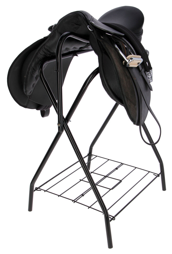 Oodlný skládací stojan na sedlo, uzdečku a odkládacím prostorem.• odolný a stabilní stojan, s věšákem na uzdu a velkým úložným prostorem